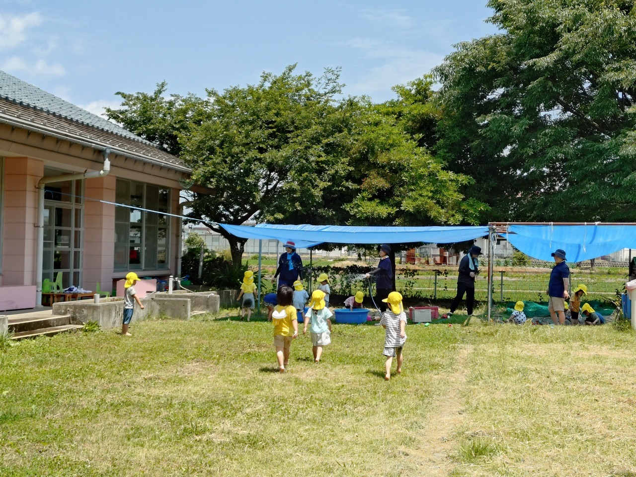 園庭の脇には備え付けのプールが2つ設置してあります。夏の期間、主に大きいプールは4,5歳児、小さいプ-ルは3歳児が使用しています。(未満児は簡易プールを使用しています)